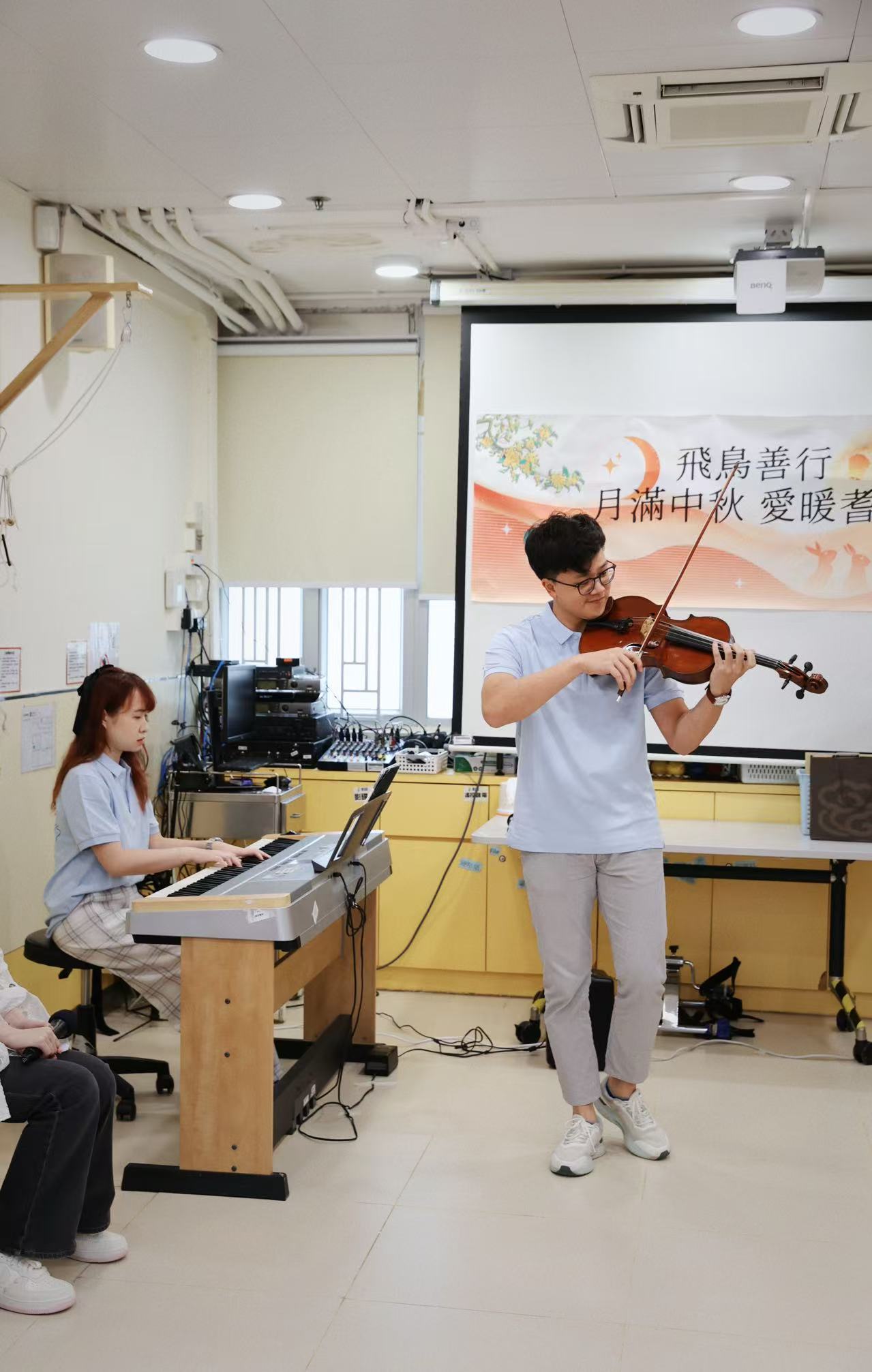 同學們傾力奉獻精彩表演,包括現場演唱、鋼琴演奏及小提琴助興。優美的旋律回響在活動空間中,贏得長者們的熱烈掌聲與歡呼聲。音樂不僅為他們帶來了節日的歡樂,更以其治癒的力量撫慰了每一顆心靈。